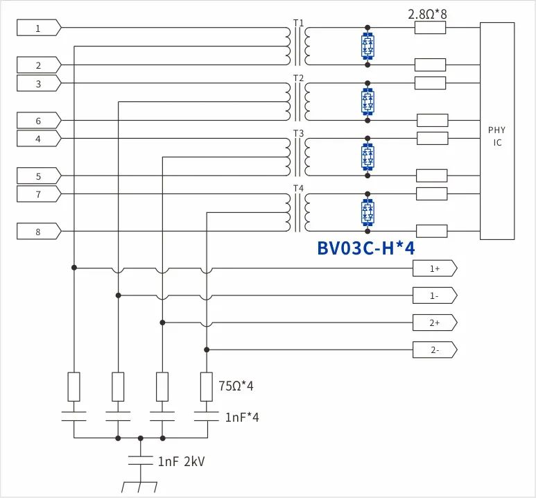 根據(jù)測(cè)試要求,對(duì)于外部的網(wǎng)口,最大能量為共模 6kV 7Ω的測(cè)試要求,電流大約為850A,能量相對(duì)較大,需要多個(gè)器件共同承擔(dān);根據(jù)標(biāo)準(zhǔn)的要求,測(cè)試完后需要滿足DC500V大于2MΩ的絕緣阻抗要求。綜上,對(duì)于PSE接口我們推薦的解決方案如下:
