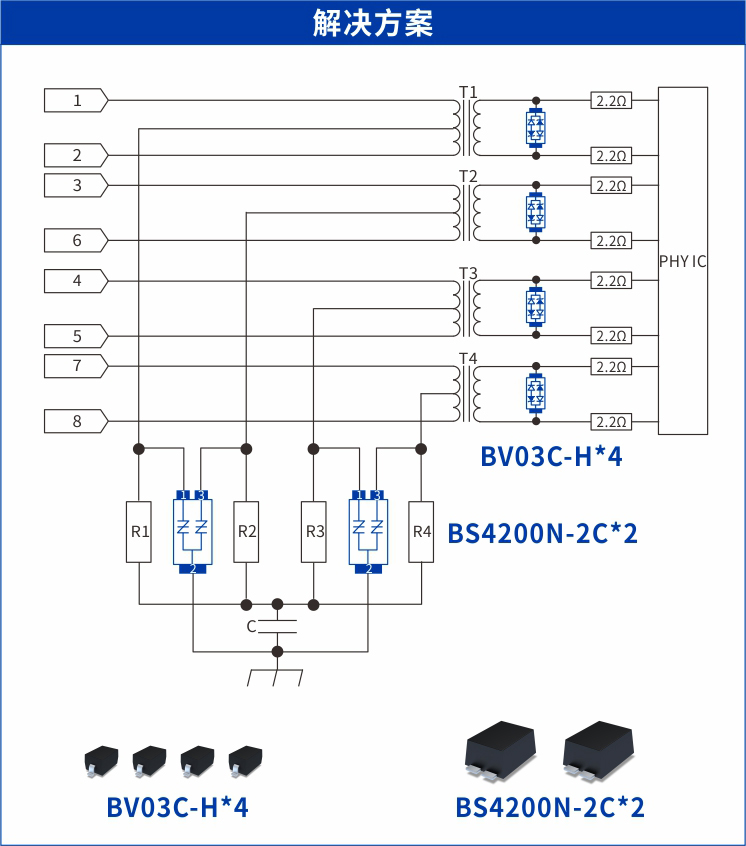 第二級(jí)防護(hù),為滿足千兆網(wǎng)口高速數(shù)據(jù)傳輸對(duì)防護(hù)器件性能參數(shù)設(shè)計(jì)要求,檳城電子推薦使用低容ESD器件BV03C-H,工作電壓 3.3V,結(jié)電容1.5pF,峰值脈沖電流25A,采用SOD323封裝,并符合IEC 6100-4-2 (ESD)±30kV (空氣放電) 和±30kV (接觸放電) 標(biāo)準(zhǔn)。該方案在75℃高溫環(huán)境下能保證數(shù)據(jù)傳輸無(wú)丟包,可吸收差模浪涌殘余能量,有效保護(hù)PHY,同時(shí)后級(jí)可以串接2.2Ω電阻作為退耦器件,阻礙浪涌或ESD電流往后級(jí)流動(dòng)迫使BV03C-H快速充分地導(dǎo)通。