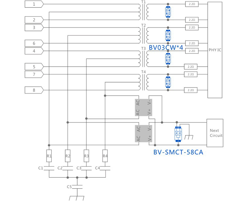 RJ45POE 10/700μs CM/DM 4KV-100A